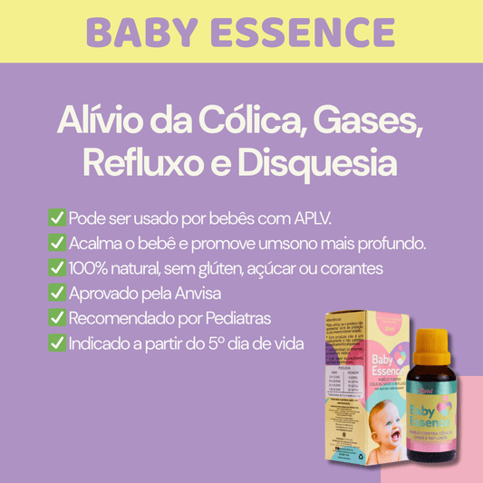 - Baby Essence – Alívio natural para cólicas, gases e refluxos, com efeito calmante que promove um sono tranquilo.